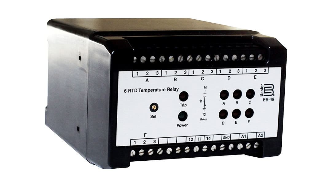ES-49 temperature relays use resistance detectors (RTDs) to monitor remote temperatures. An ES-49 relay can be specified with three or six inputs and specified to monitor copper or platinum RTDs. Microprocessor-based circuitry enhances functionality and improves performance. Internal diagnostics annunciate when relay function or accuracy is compromised.