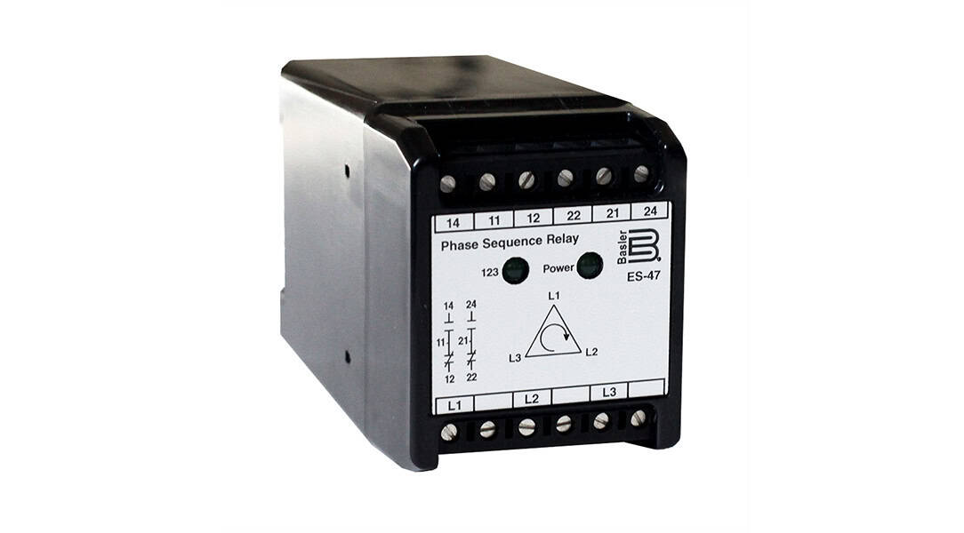 The ES-47 Phase Sequence Relay monitors a three-phase, three-wire system for correct phase rotation/sequence. It provides protection against incorrect phase sequence, phase loss, and undervoltage. ES-47 relays operate on only the fundamental component of the sensed voltage, rejecting all harmonic components.